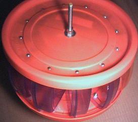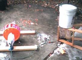 Use one container of a different color to aid counting revolutions in a given stop watch timed run to determine RPM. One can measure the time it takes for say 20 revolutions to determine RPM. I used 12 containers (Good Buy Mini Container distributed by PTS long Beach Ca) and two 5 gallon bucket lids. These were purchased at a $.99 store for 3/$.99. Once all 12 are bolted together on the back side then unbolt the bottom container and place it on top, drilling and bolting it in. Now take a disk sander and sand off the lips on the sides that will be bolted to the bucket lid. This makes it so one has a flat edge to bolt to the lid. Next open the stack of containers into a circle and put the last bolt in to hold it circular.