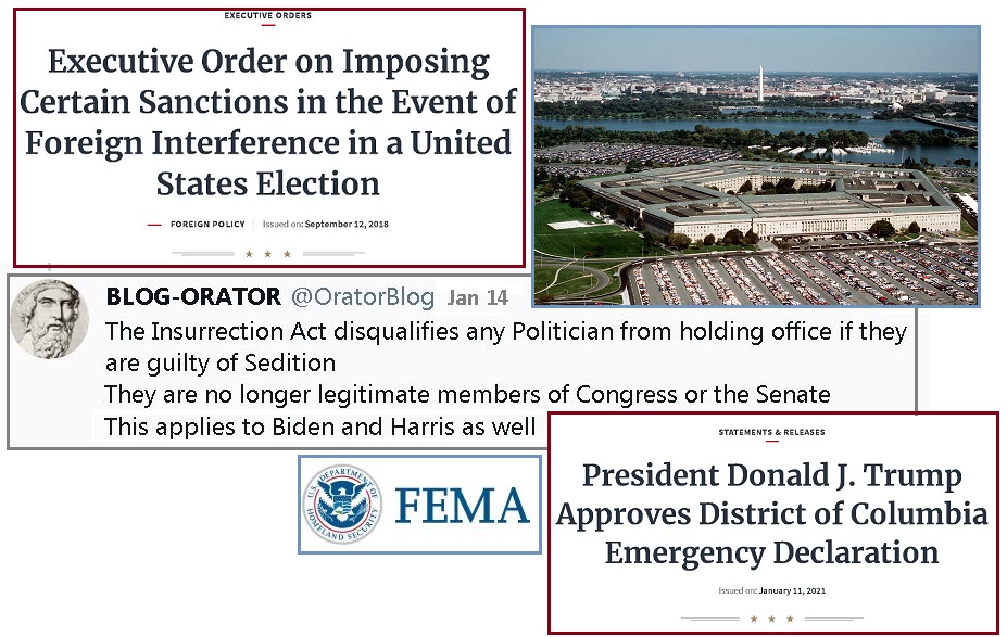 The Zetas have stated we have been under some form of Martial Law since the Fall of 2015 when Obama failed to announce Nibiru’s approach. Then there was the EO on March 1, 2018 instituting Tribunals. There is also the Executive Order on foreign interference with a US election signed by President Trump on September 12, 2018. And now the physical threat on DC, authorizing FEMA to intervene, signed on January 11, 2021. And then there are the physical incursions by the Chinese coming over the border from Canada, and the threat of incursions from Mexico.