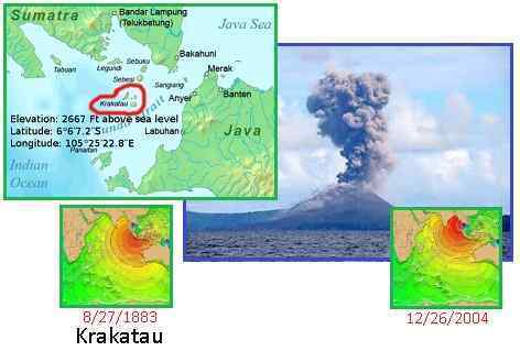 I've been 4 years following ZetaTalk news. Recently, several vulcanos errupted in Indonesia, causing major damages ie Mt. Sinabung and Mt. Kelud. Other vulcanos are also showing the activity increase such as Mt. Papandayan West Java and Mt. Krakatau at Sunda Strait. My Question is there any posibility Mt. Krakatau errupt in the near future and causing big tsunami like before ? Is there any connection with sea water level decreased in Banten recently? Second question, did Mud Vulcano in Sidoarjo, Surabaya East Java caused by man made or natural disaster in connection with Java island movement hit by Indo-Australian plate as per Zeta theory? [and from another] http://www.ngdc.noaa.gov/hazard/tsu_travel_time_events.shtml The explosion of the Krakatau Volcano in Indonesia on August 27, 1883, generated a 30 meter tsunami in the Sunda Strait which killed about 36,000 people. It also caused an atmospheric pressure wave that was recorded on the tide gauges at remote locations including South Georgia Island, Panama, France, England, Alaska, Hawaii, and San Francisco. Due to the shadowing by continents and island groups, a direct tsunami could not have reached most of these locations. Atmospheric gravity waves occurred which may have excited water waves by transferring energy into the ocean. It was recorded with an amplitude of six inches at Sausalito, California. A magnitude 9.1 Mw earthquake occurred off the west coast of Sumatra, Indonesia, on December 26, 2004. [and from another] http://en.wikipedia.org/wiki/Krakatoa Krakatoa, or Krakatau is a volcanic island situated in the Sunda Strait between the islands of Java and Sumatra in Indonesia. The name is also used for the surrounding island group comprising the remnants of a much larger island of three volcanic peaks which was obliterated in a cataclysmic 1883 eruption, unleashing huge tsunamis (killing more than 36,000 people) and destroying over two-thirds of the island. The explosion is considered to be the loudest sound ever heard in modern history, with reports of it being heard up to 3,000 miles (4,800 km) from its point of origin. The shock waves from the explosion were recorded on barographs around the globe.
