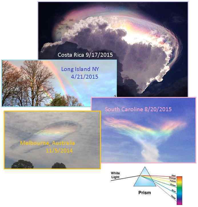 Another weather phenomena it seems that could be related to Planet X? May I ask the Zetas if this is due to EMP? or petro chemical residues in the upper atmosphere? [and from another] Will zetas comment? [and from another] https://m.youtube.com/watch?v=jAcAMfwBRZY&feature=youtu.be [and from another] http://www.wnd.com/2015/09/end-of-times-cloud-awes-costa-rica-witnesses/ [and from another] http://abcnews.go.com/US/mysterious-iridescent-end-times-cloud-phenomenon-spotted-costa/story?id=33834206 An iridescent, multi-hued cloud phenomenon was recently spotted in Costa Rica skies. The spectacle in the sky was reported on in numerous cities including, San Jose, Parrita, Pavas, Escazu and Hatillo. The colorful luminescence is caused by the sun's light being refracted by water droplets and ice crystals in the cloud, said, Eladio Solano, a meteorologist with Costa Rica's National Meteorological Institute. September 17, 2015 [and from another] http://abcnews.go.com/US/beachgoers-snap-stunning-photos-rare-fire-rainbow-south/story?id=33209513 A dazzling "fire rainbow" lit up the sky in South Carolina, stunning onlookers who scrambled for their cameras to snap the rare phenomenon. August 20, 2015 [and from another] http://abcnews.go.com/US/quadruple-rainbow-photographed-york-rainstorm/story?id=30477035 This morning, the sun came out -- along with a quadruple rainbow! Amanda Curtis spotted the magnificent phenomenon from the Long Island Rail Road station in Glencove. While the primary rainbow is formed by direct sunlight passing through raindrops at a proper angle, the other three rainbows are formed by reflections of the sun, usually from calm water, according to the National Center for Atmospheric Research (NCAR). These other rainbows are known as reflection rainbows. April 21, 2015. [and from another] http://www.latest-ufo-sightings.net/2014/11/spaceship-looking-cloud-rainbow-colour-causes-panic-alien-invasion.html A mysterious cloud with rainbow colour appears strange for Wonthaggi residents who witnessed it. The village is located 130 kilometres outside of Melbourne, Australia. November 5, 2014.
