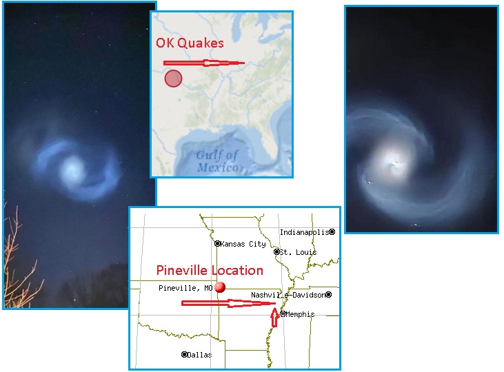 If the quakes in OK and TX indicate that the land there is being pulled down to the SW, then how does this affect the hard rock of the Ozarks? We have confirmed that when this slide to the SW pulls the hard rock on either side of the town of New Madrid apart, the rupture of the New Madrid fault line will occur. Meanwhile, the Ozarks are experiencing rock compression, and this results in electronic screech in the rock. This screech is an attractant for any charge in the atmosphere, which then wants to ground. This blue spiral is very similar to the Norway spiral in 2009.