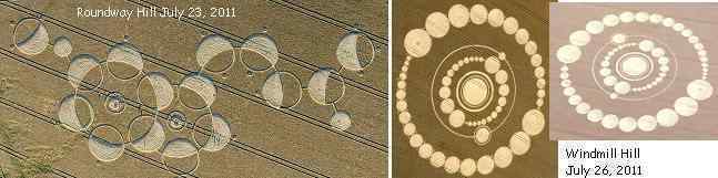 Can you please ask the Zetas if this crop circle is real or MM? 2011.7.25 Roundway Hill circle (never seen something like this before so can`t understand the meaning) http://www.cropcircleconnector.com/2011/roundwayhill2/roundwayhill2011b.html, http://www.cropcircleconnector.com/2011/Etchilhampton/Etchilhampton2011a.html [and from another] 2011.7.20 Charlbury Hill circle, is it Zetas? (This picture is not exactly the same as the zetatalk logo.) Are the drawers saying "hello, you Zetas have done good job"? Or it is just another fake? (By the way what does the three circles below mean?) http://www.cropcircleconnector.com/2011/charlbury2/charlbury2011b.html [and from another] What encoded in this CC'S below? Mayan Calendar (similar to 2005 formation) http://www.cropcircleconnector.com/2011/eastkennett2/eastkennett2011b.html And crescents and spheres http://www.cropcircleconnector.com/2011/roundwayhill/roundwayhill2011a.html [and from another] New CC in Windmill. What planets are on depicted orbits? Do the two concentric circles formed by two semicircles each of growing spheres represent lunar months? And do the two solitary spheres orbiting between said two concentric sphere circles represent Planet X (the bigger of the two) and Earth (the smaller) - or is one of them Venus? Why is the inner concentric circle formed by growing spheres formed by two identical semicircles with each 12 spheres, while the outer concentric circle is so different, with 14/18 spheres? http://www.cropcircleconnector.com/2011/windmillhill2/windmillhill2011b.html