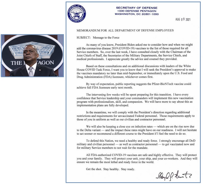 general serving as the 28th United States secretary of defense since January 22, 2021. On December 7, 2020, he was nominated for defense secretary by then-President-elect Joe Biden. [and from another] Defense Secretary to Mandate COVID Vaccine for US Military by Sept 15 August 9, 2021 https://www.foxnews.com/politics/pentagon-covid-vaccine-mandate All military troops will have until Sept. 15 to get vaccinated, according to a memo sent by Defense Secretary Lloyd Austin to all Department of Defense employees. The Pfizer vaccine is expected to be approved by the Food and Drug Administration in early September. Should that not happen, Austin could seek a presidential waiver to require troops to get the vaccine. President Biden endorsed the idea of a vaccine mandate in a statement.
