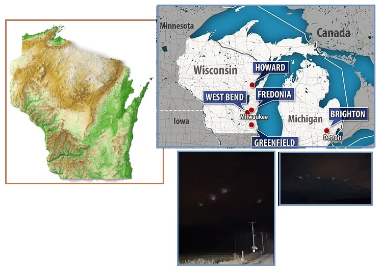 Would the Zetas Care to Comment on This? [and from another] Close Encounters of the First Kind? MULTIPLE Witnesses Share Extraordinary Videos of Possible UFO Sighting in Rural Wisconsin December 19, 2022 https://www.dailymail.co.uk/news/article-11554579/Residents-rural-Wisconsin-share-extraordinary-videos-possible-UFO-sighting.html The footage from December 1 shows bright white lights zipping across cloudy skies over the rolling farmland near West Bend and Fredonia, Wisconsin. ‘It kept moving to the east, There was no sound to it. It was a pretty clear and normal Wisconsin night without any crazy weather.' In the first video, filmed from a suburban sidewalk into the cloudy sky, one white light appears and then three more flash on in a triangular shape around it, disappear, then the central light moves off at high speed and disappears over the horizon. In the second video a yellowish light blazes across the sky in an arc, stops momentarily then makes a 90-degree change of direction.