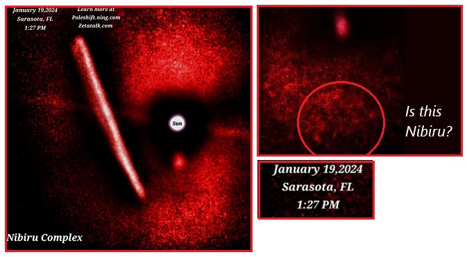 Nibiru has moved closer to the Earth, and this can be seen by the Petrol blobs and fog increasingly filling the skies. Moon Swirl Tubes will also appear larger as they come closer. But Nibiru continues to be shrouded by Petrol, only very occasionally without its Petrol shroud. The assisted photos displayed on the Pole Shift Ning site, where the Petrol was blown away by benign aliens, are exceptions. Nibiru is directly below the Sun in this photo taken at noon in Florida by Mario, but is not within the large Petrol mass circled but above, closer to the Sun. This can be seen by the shadow cast on the top of this Petrol mass, which shows sunlight from both the Sun and reflected sunlight from Nibiru.
