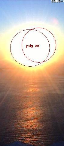 - Santorini has historically had the White Persona (small object) at the 2-3 o'clock position, as shown on June 9, and the Red Persona at the 6 o'clock position at sunset, as shown on June 21. This has changed. Notice that in addition to increasing size and occultation of the Sun, the White Persona has swung closer to the Ecliptic by July 24 and is now beneath the Sun, and the Red Persona is now occulting the Sun to the left. By July 28, occultation has progressed! Compare this position to the near occultation in Italy on July 29, and complete occultation by July 30!