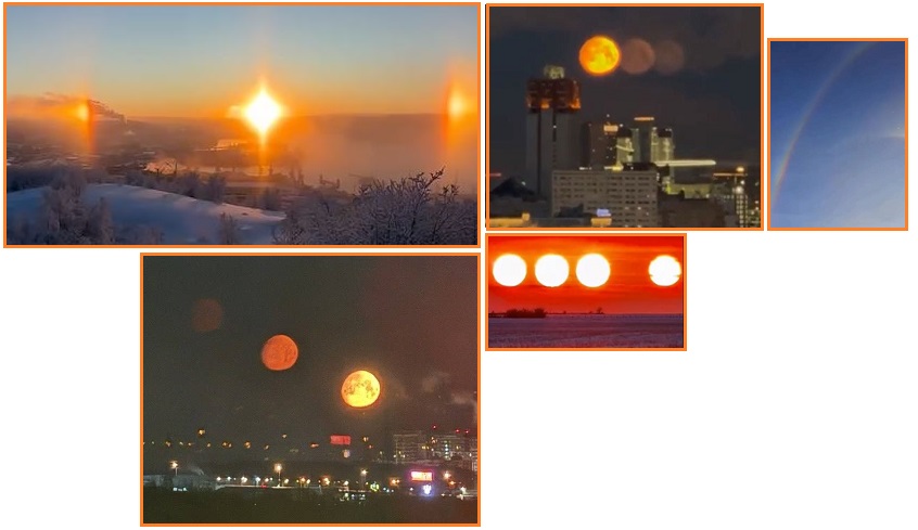 The other day we saw the appearance of the effect of 4 suns over Alaska, and today 3 Moons were observed over Moscow. Also, cases of Solar halos have become more frequent everywhere. In the comments to the video, people themselves write that they have lived in these regions for how many years, but they do not recall this, although official sources continue to claim that this is the effect of the formation of ice crystals at high altitudes, scattering sunlight. But for some reason it seems to me that this is already the effect of the scattering of sunlight in the earth's atmosphere, from the Nibiru complex located between the earth and the sun. Also, many people began to notice that in photographs and videos, the sun takes on any shape (rhombus, square, rectangle, polyhedron), but not a perfect circle. Would the Zetas like to comment on this on ZetaTalk?